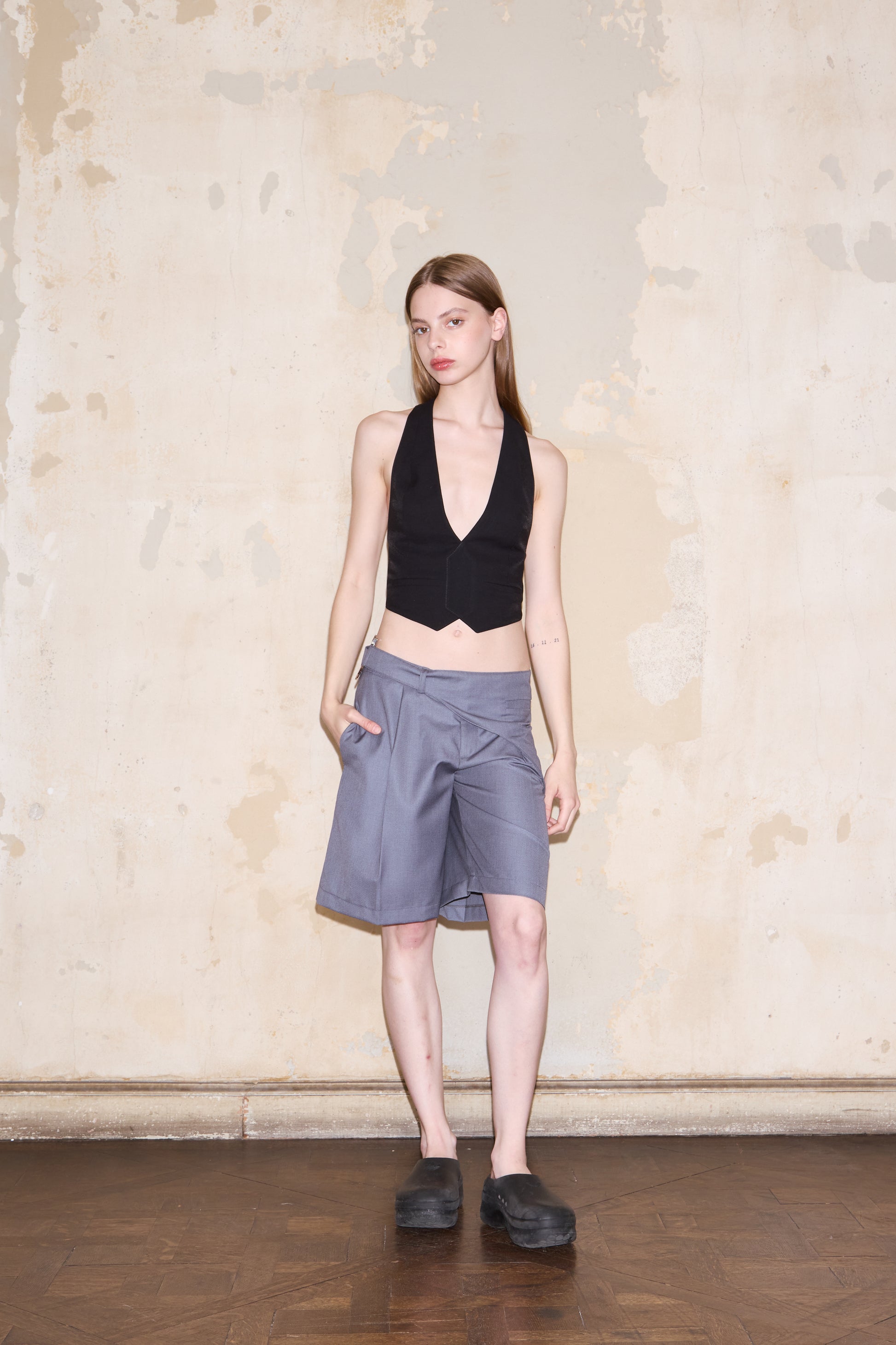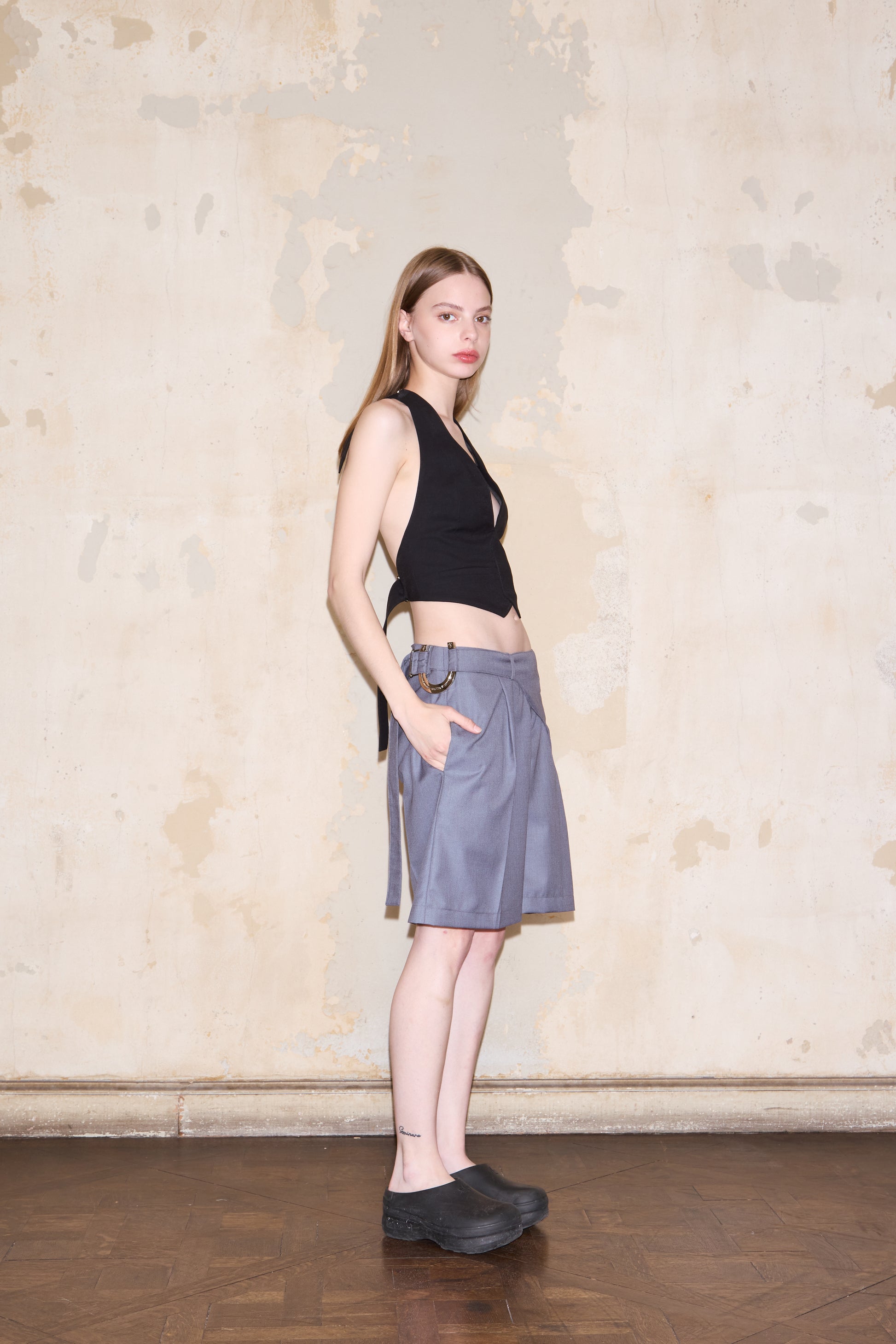 Bermudas a la rodilla con cinturon/cartera desmontable en forma de montura con bolsillo que pasa por presillas. Cierra en el frente con 1 herradura ESQUINA.