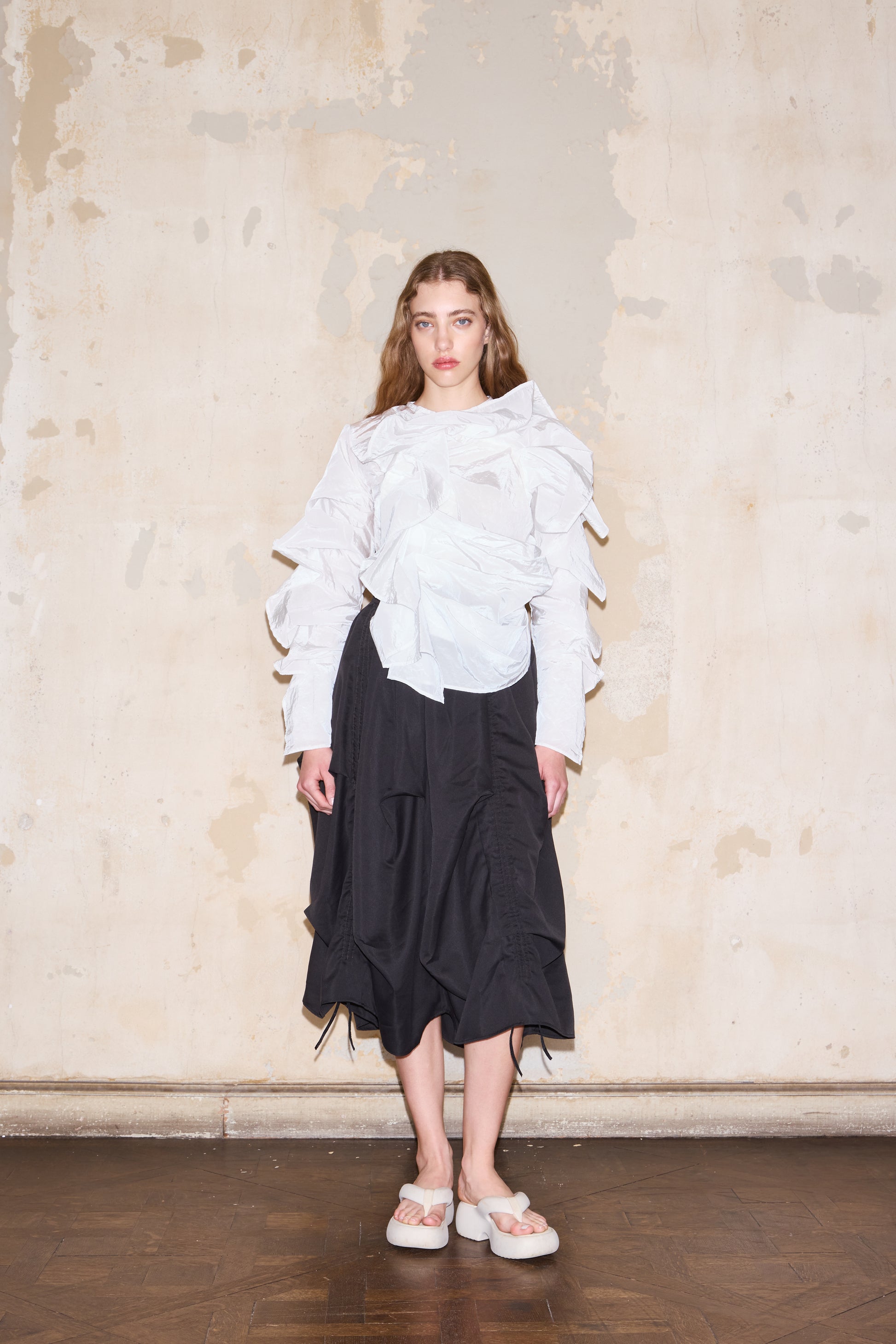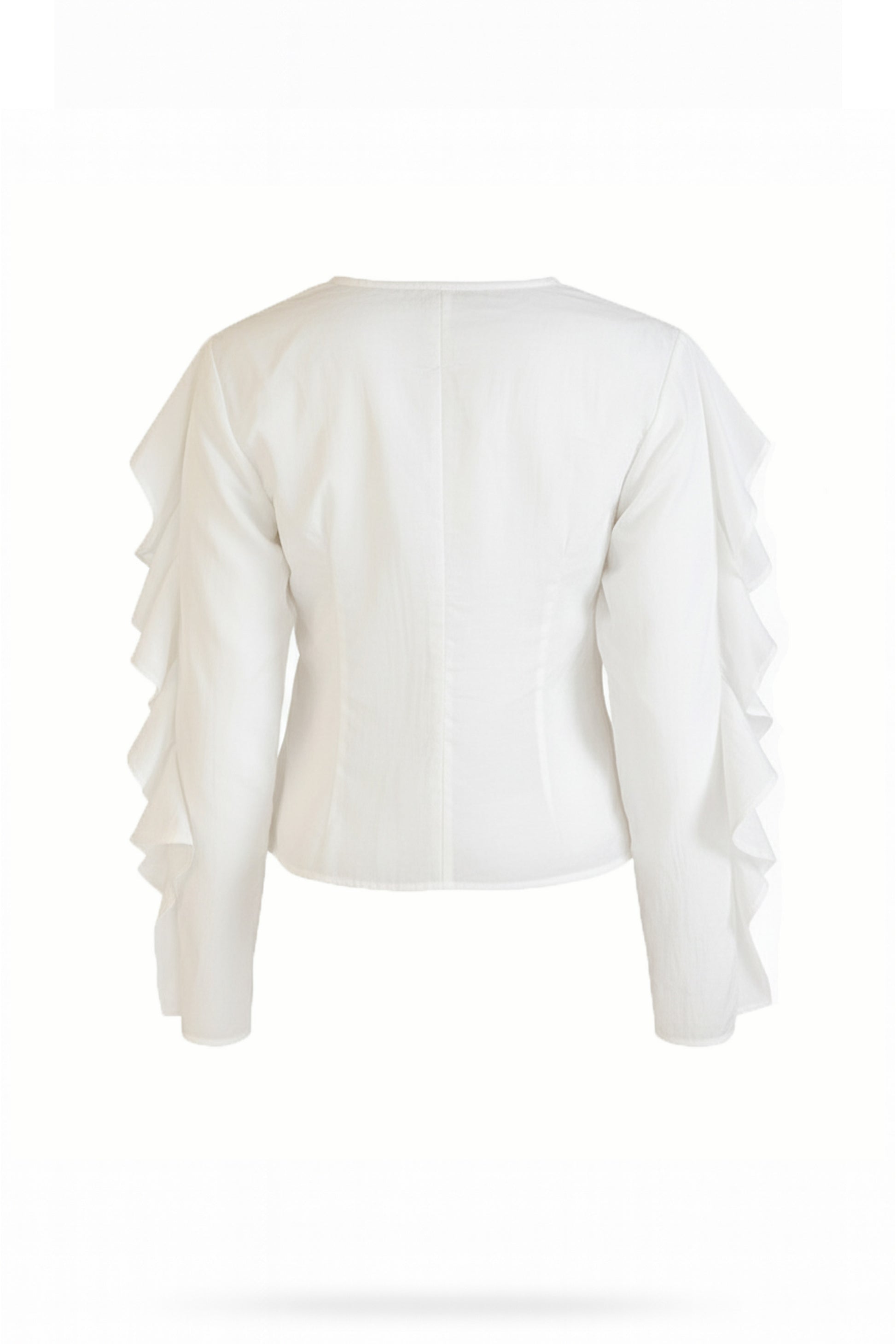 Blusa con volúmen, drapeada y con volados en frente y mangas.