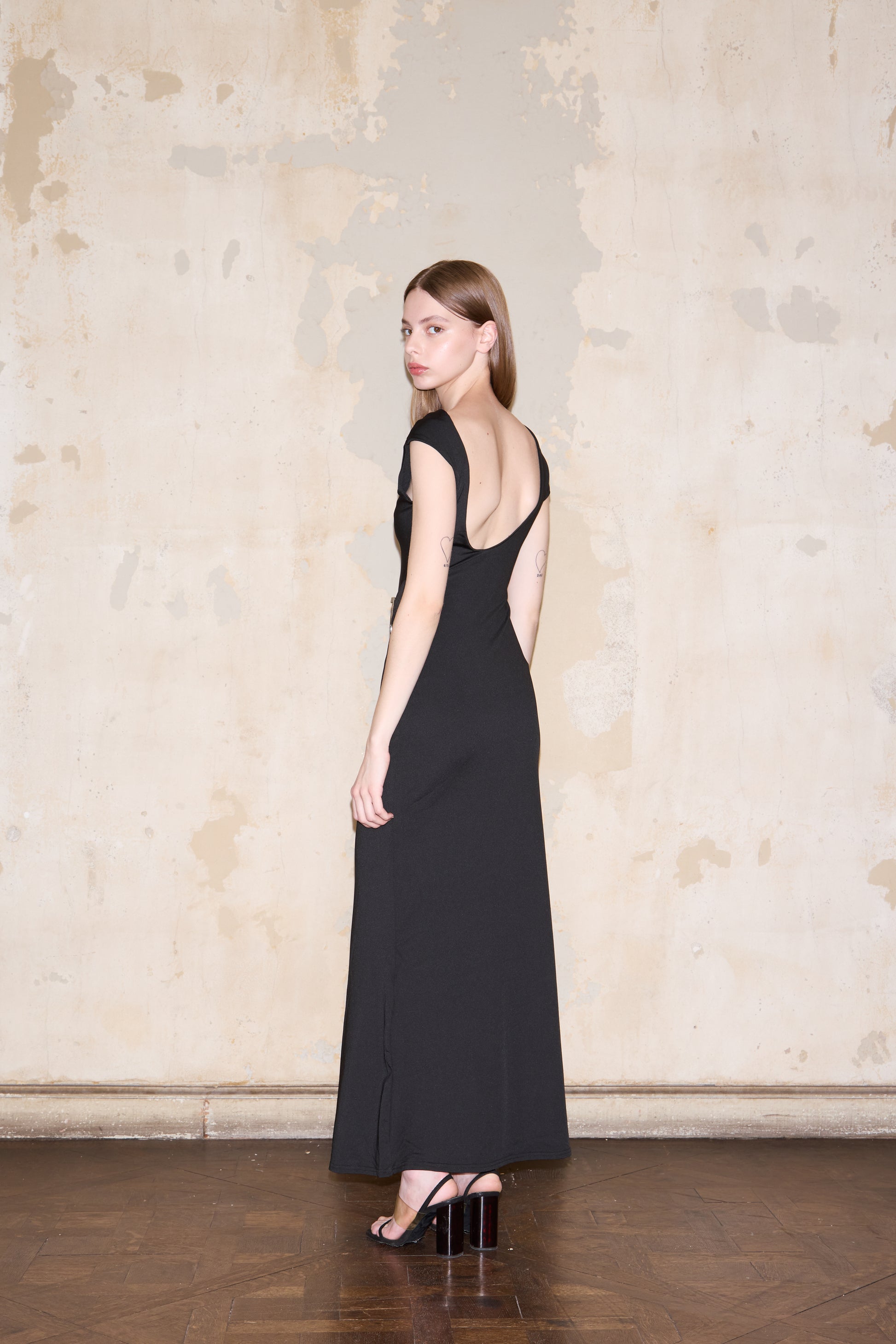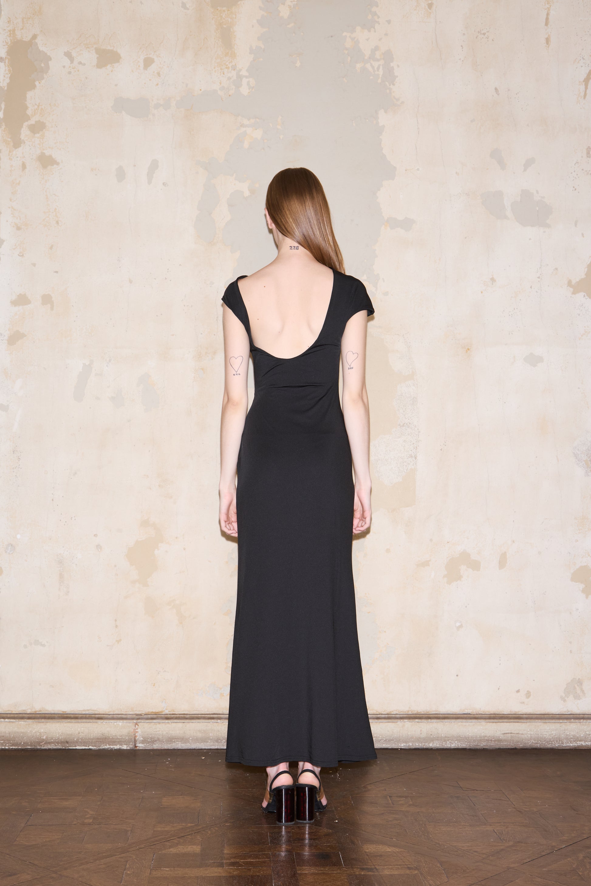 Vestido largo de mangas cortas con escote asimétrico y una pequeña abertura frontal. Presenta un drapeado en la cintura adornado con el detalle de herradura ESQUINA. Espalda descubierta.