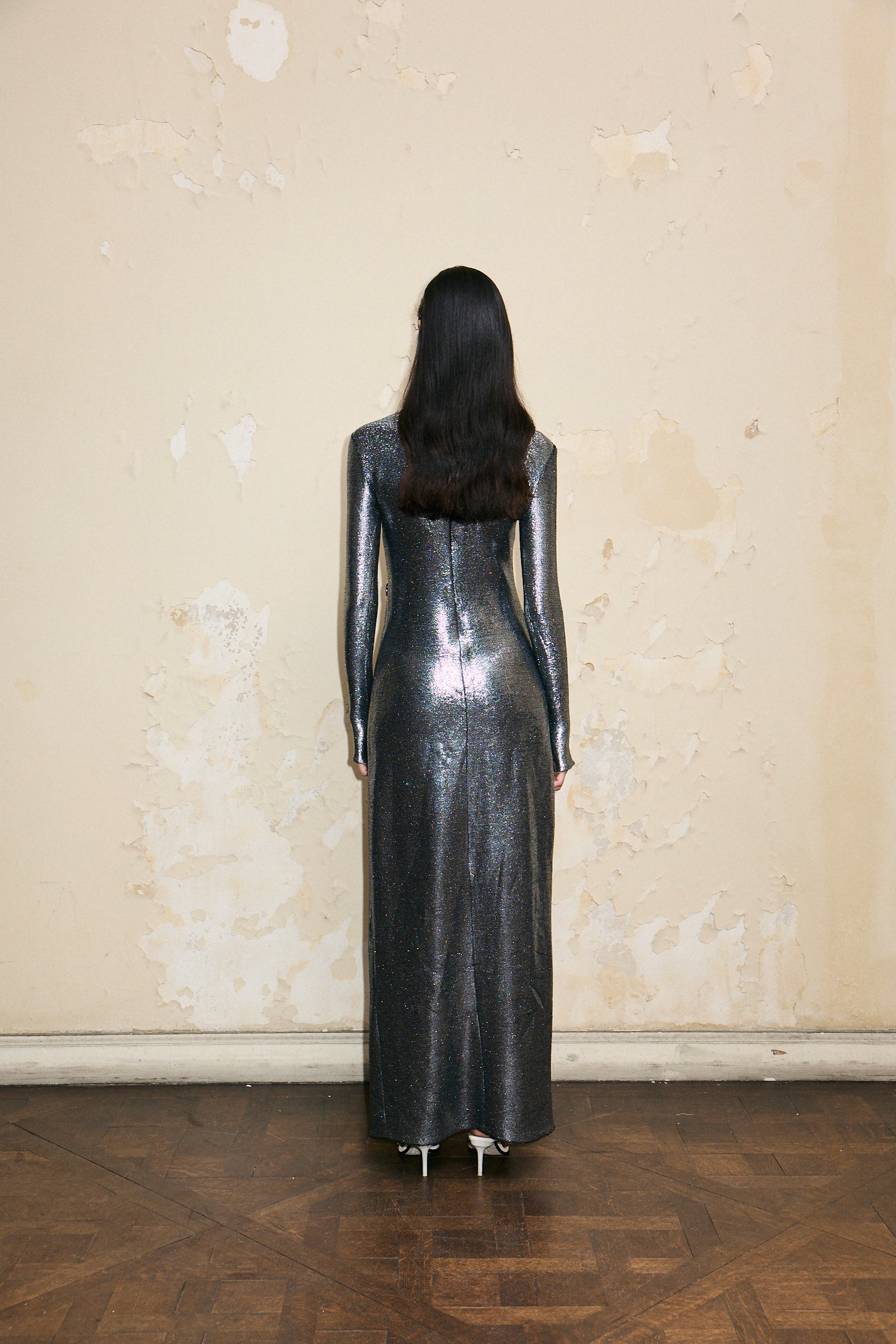 Vestido largo ajustado al cuerpo con mangas largas, cuello semi alto, gran tajo y transparencias. Decorado con monedas ESQUINA sobre las transparencias del cuello y uno de los lados.