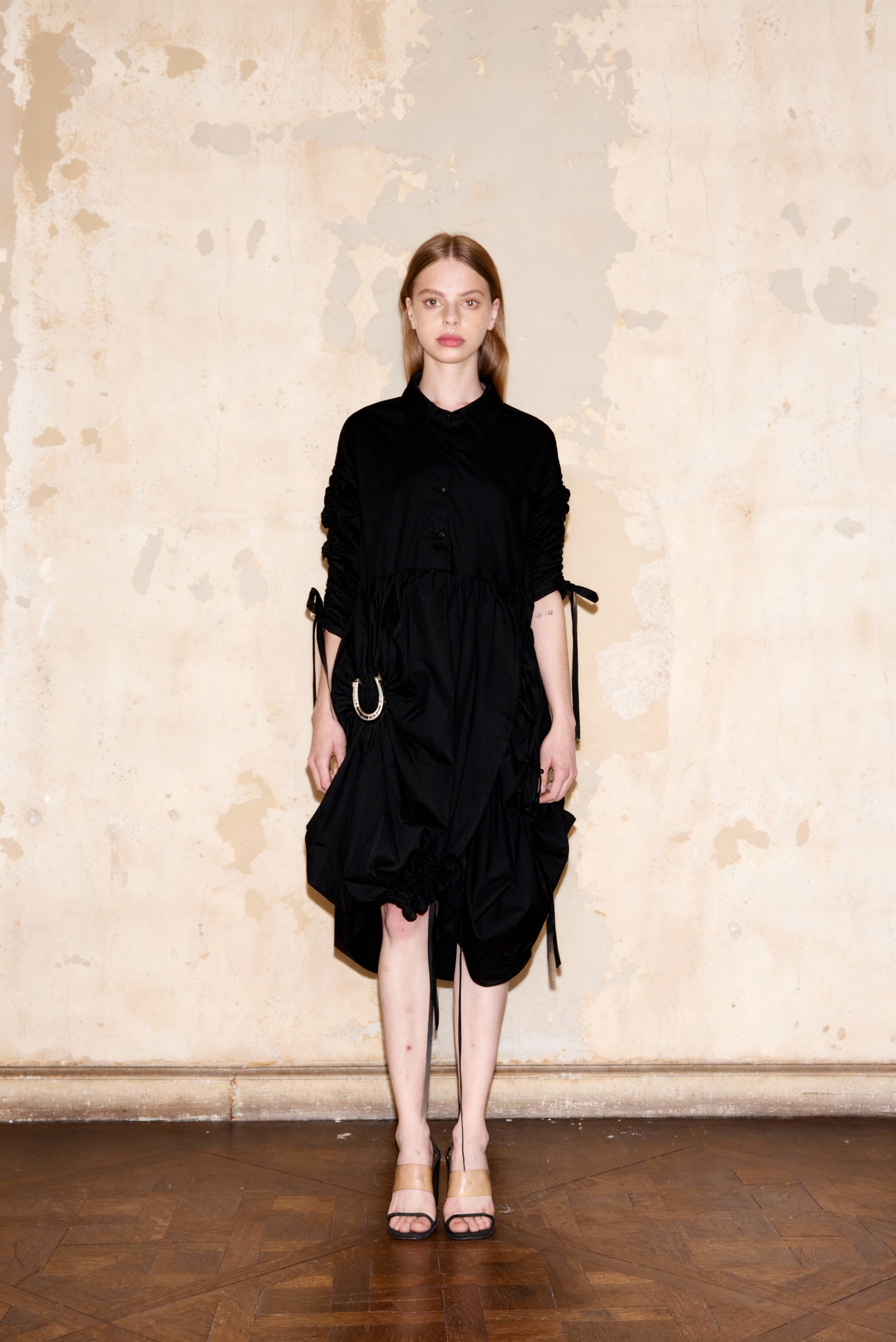 Vestido camisero de poplin a media pierna con mangas y corte en la cintura alta desde donde sale la falda semi acampanada. Mangas y falda con canaletas y tiras para fruncir. detalle de herraduras ESQUINA.