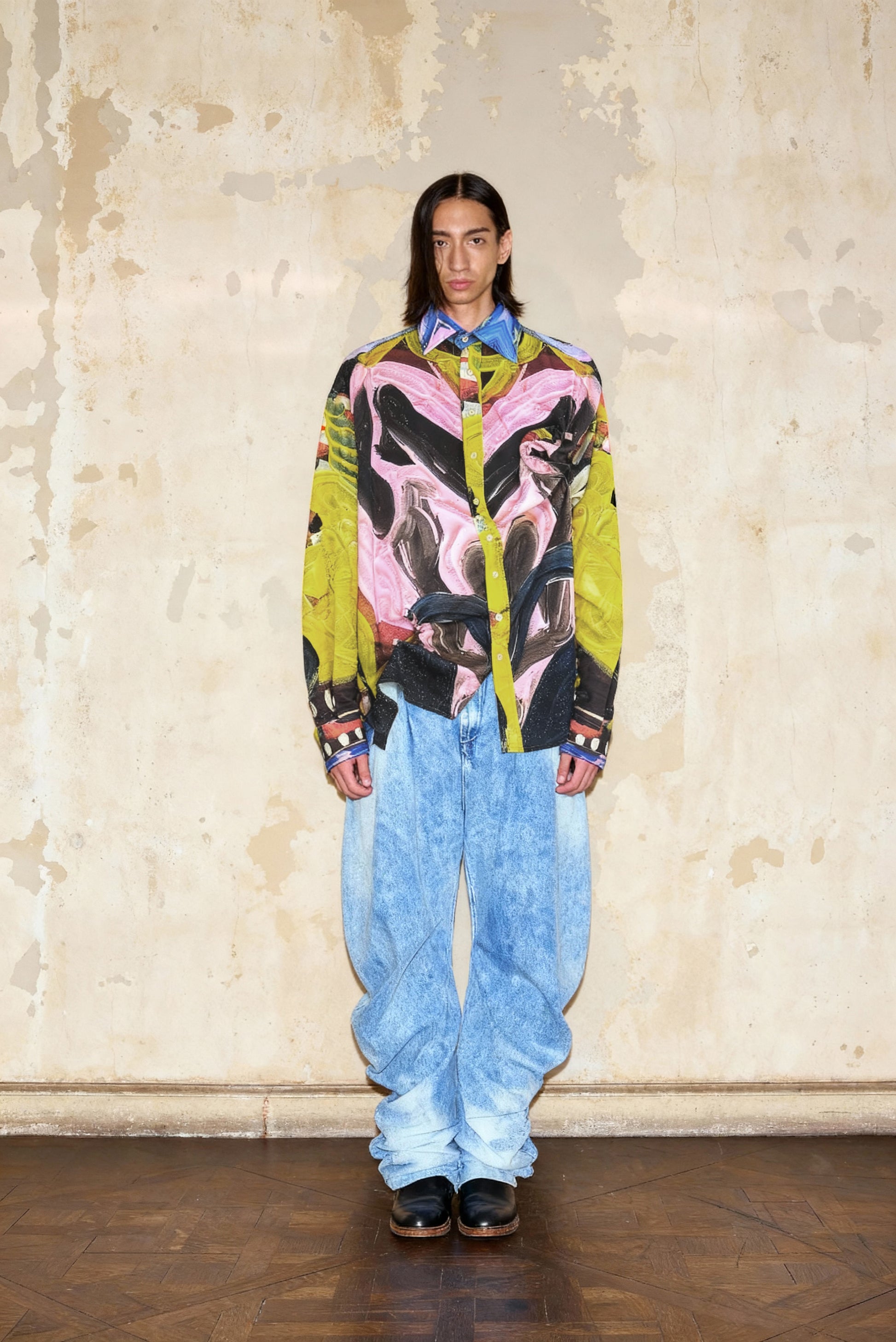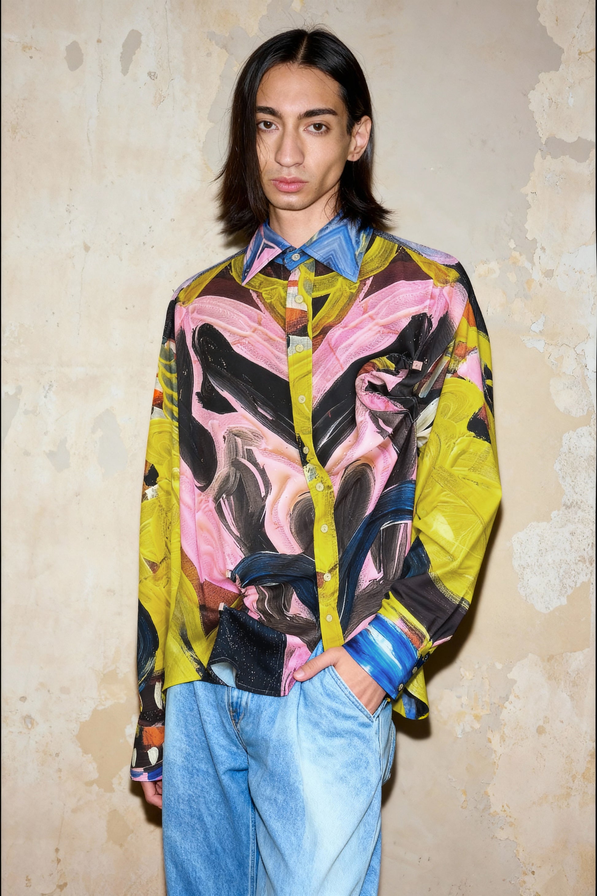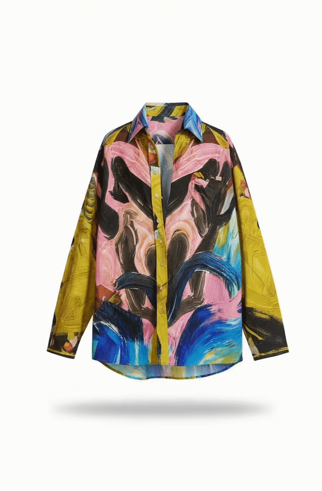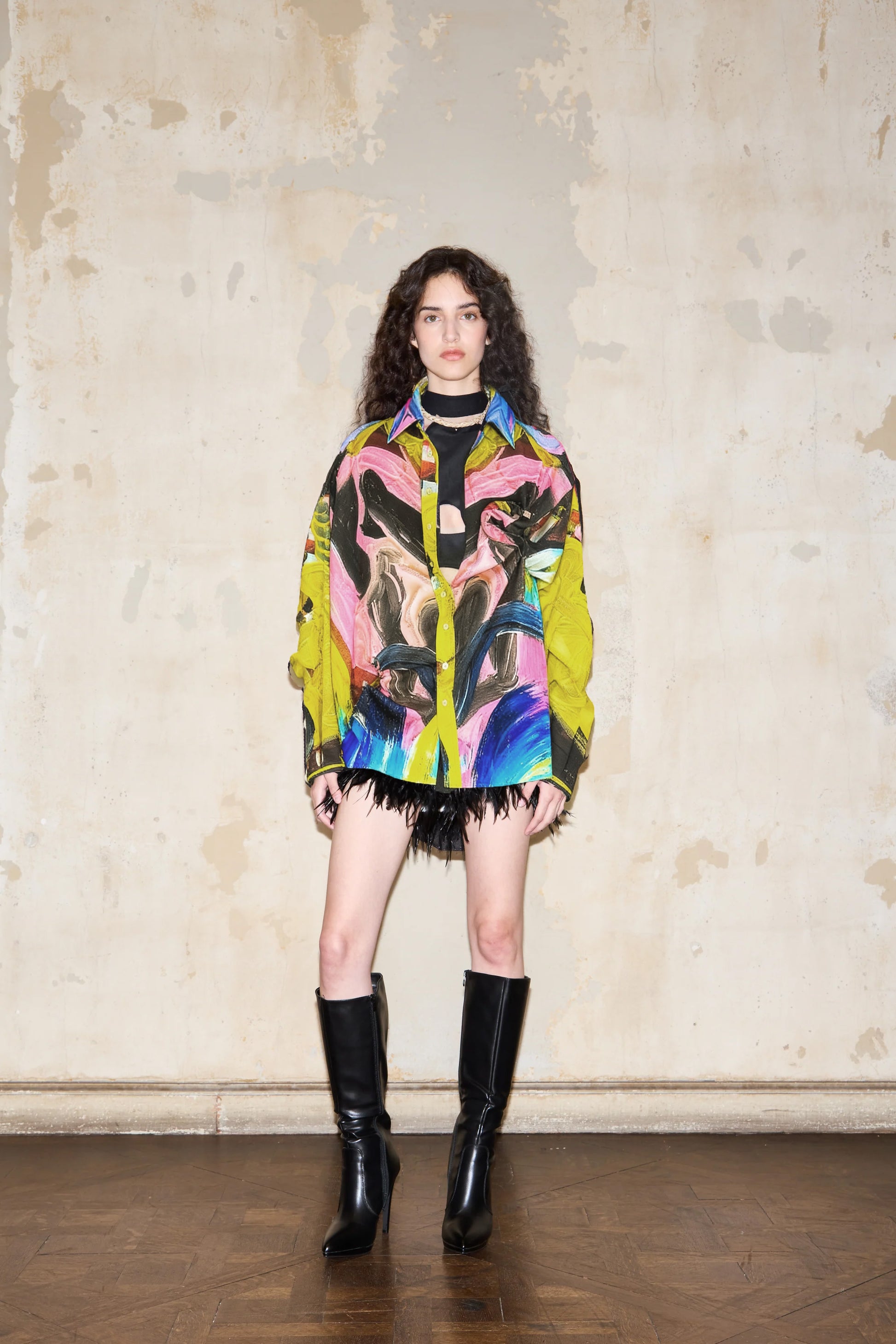 Camisa genderless oversize que puede usarse de dos maneras. Con las herraduras ESQUINA que se insertan en cuñas para drapear o sola quedando una camisa oversize clasica.