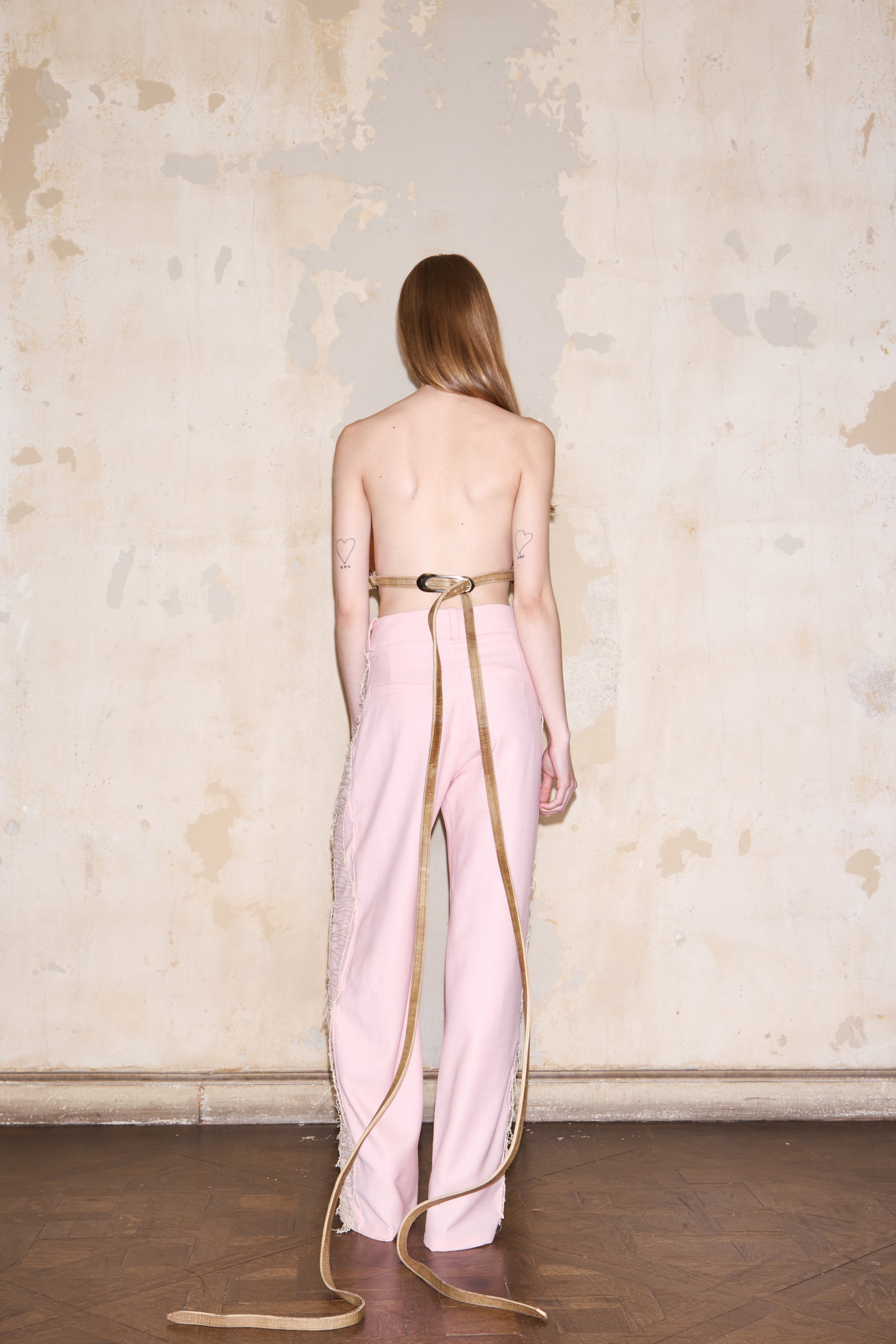 Blazer oversize que presenta cierre en frente con botón y sistema de ajuste posterior en espalda para personalizar el fit. Hombros prominentes. El detalle distintivo radica en la franja de chaguar que recorre la manga, una fibra natural tejida a mano por Anabela y Antonia Pérez, artesanas wichí de la Comunidad Santa María, en Santa Victoria Este (Salta), en colaboración con la ONG Alas a las Raíces.