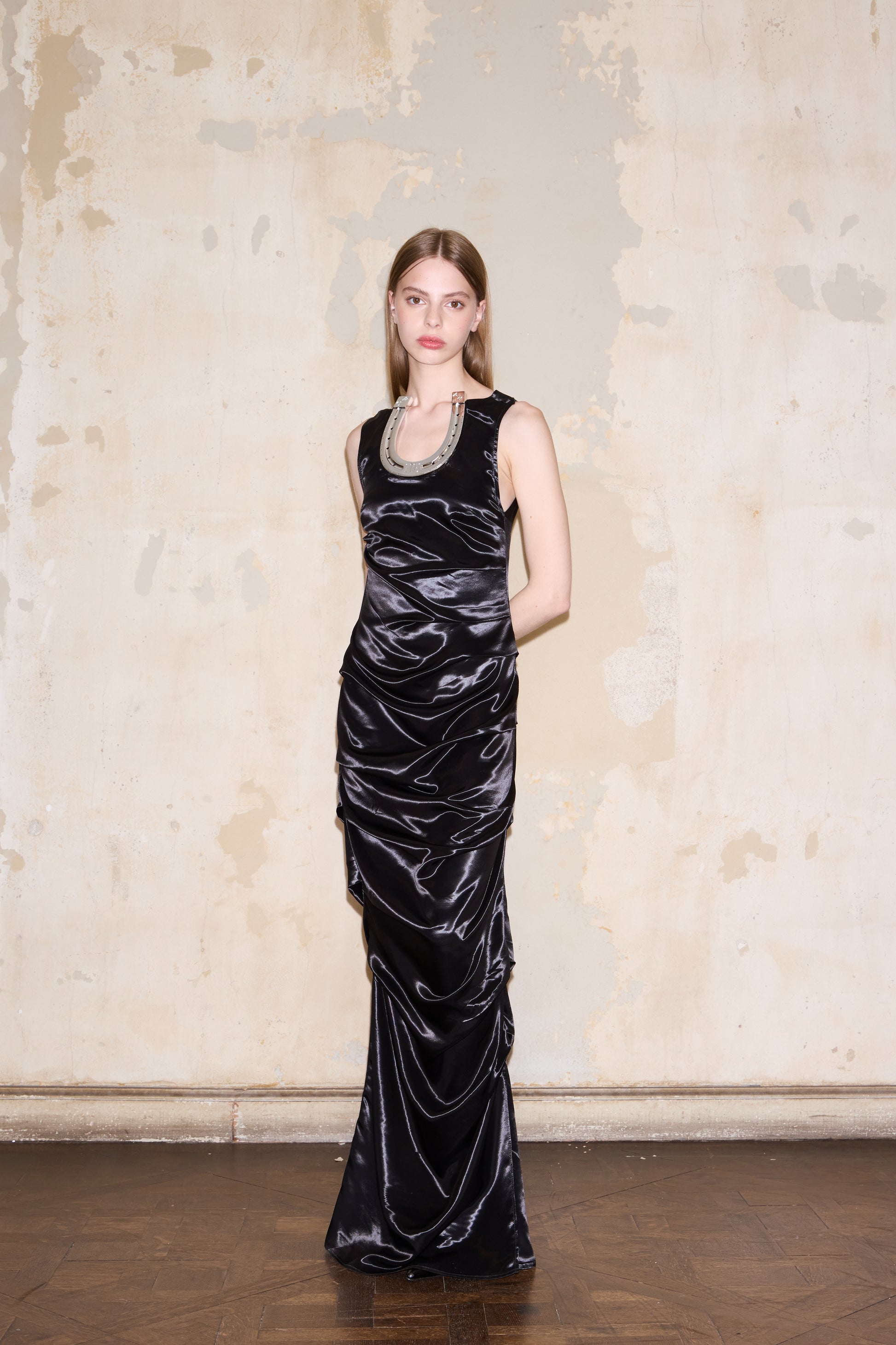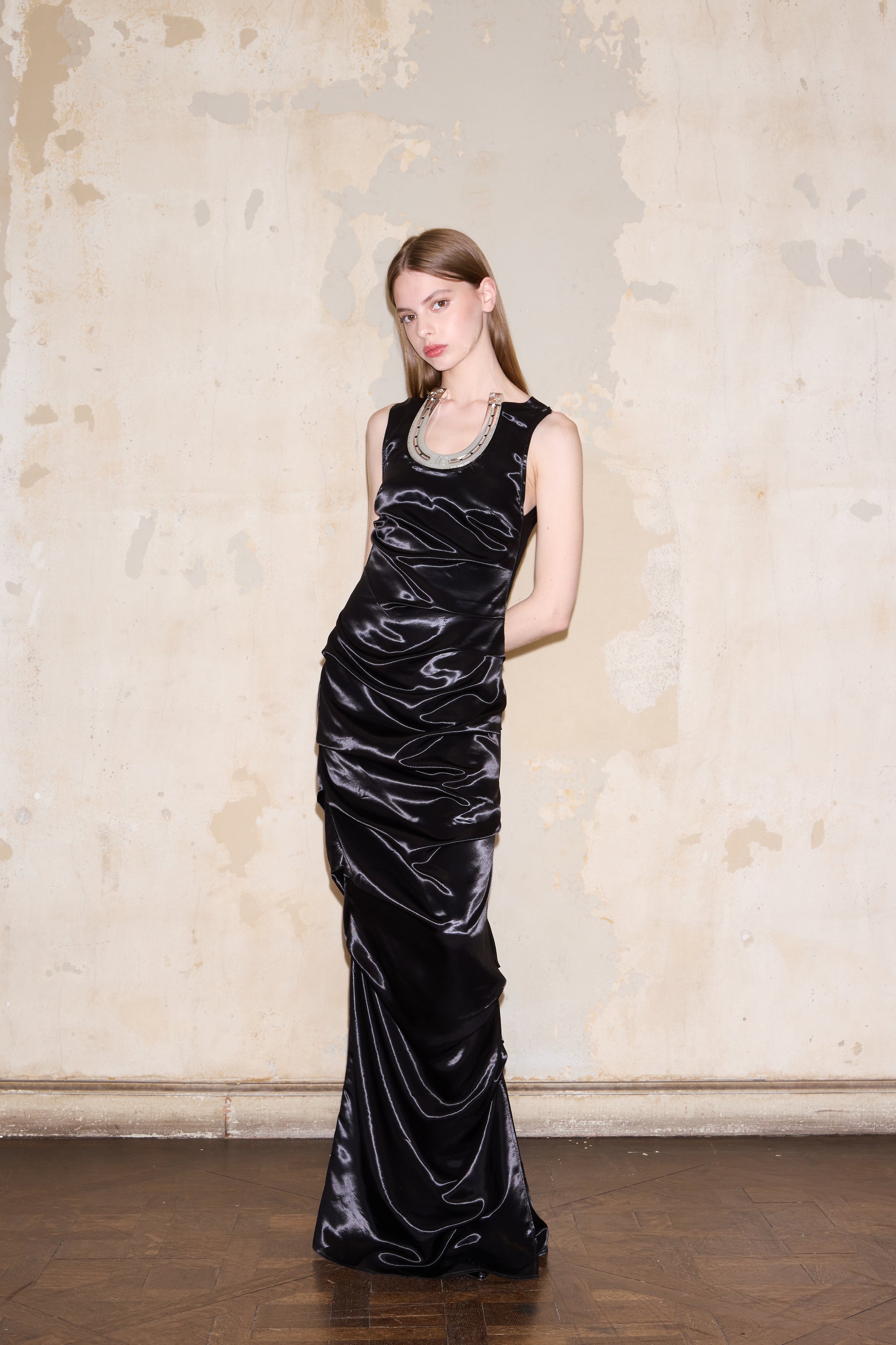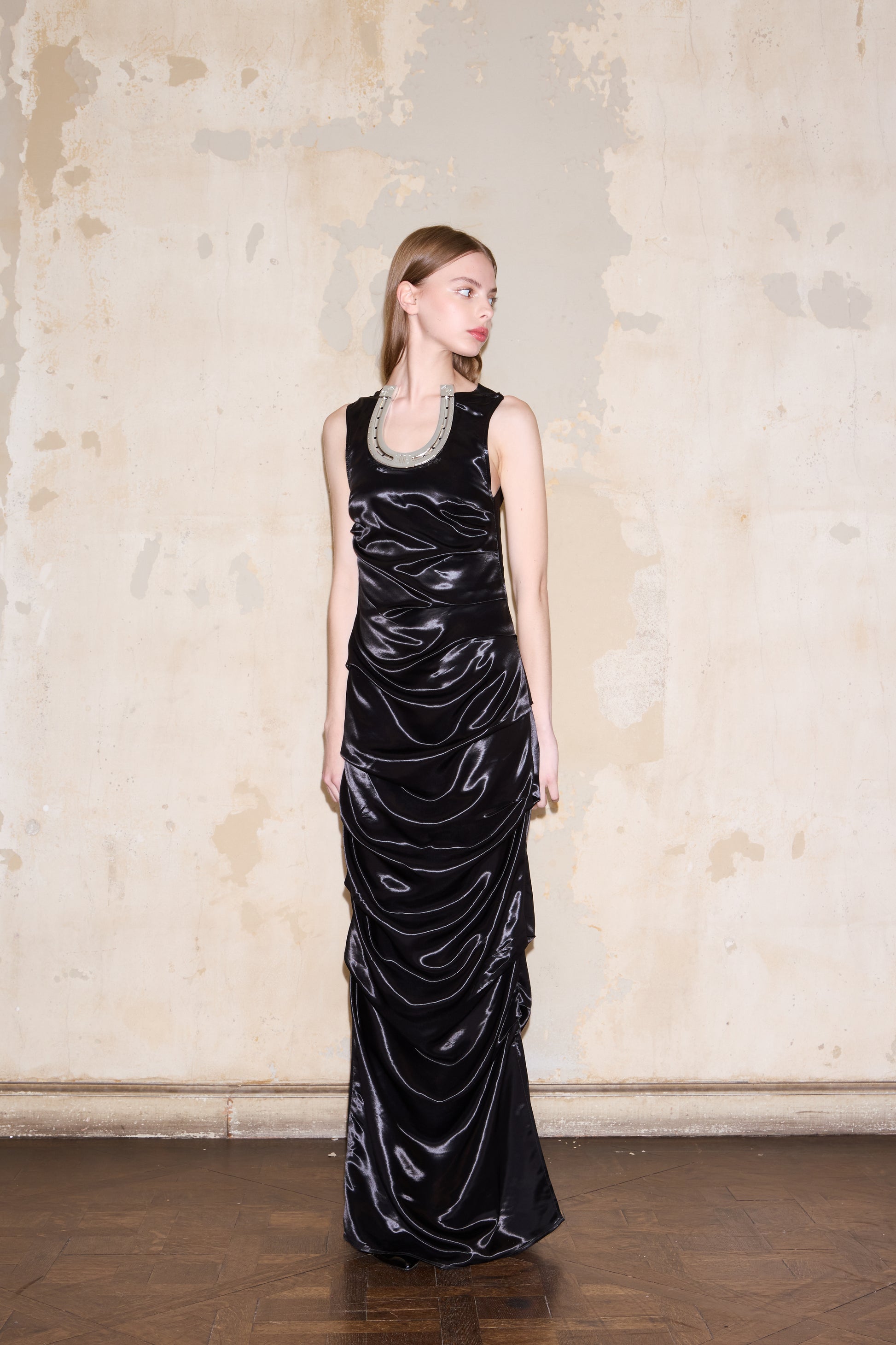 Vestido largo drapeado al cuerpo sin mangas. Escote con herradura grande ESQUINA. Espalda abierta con detalle de 2 herraduras chicas ESQUINA.