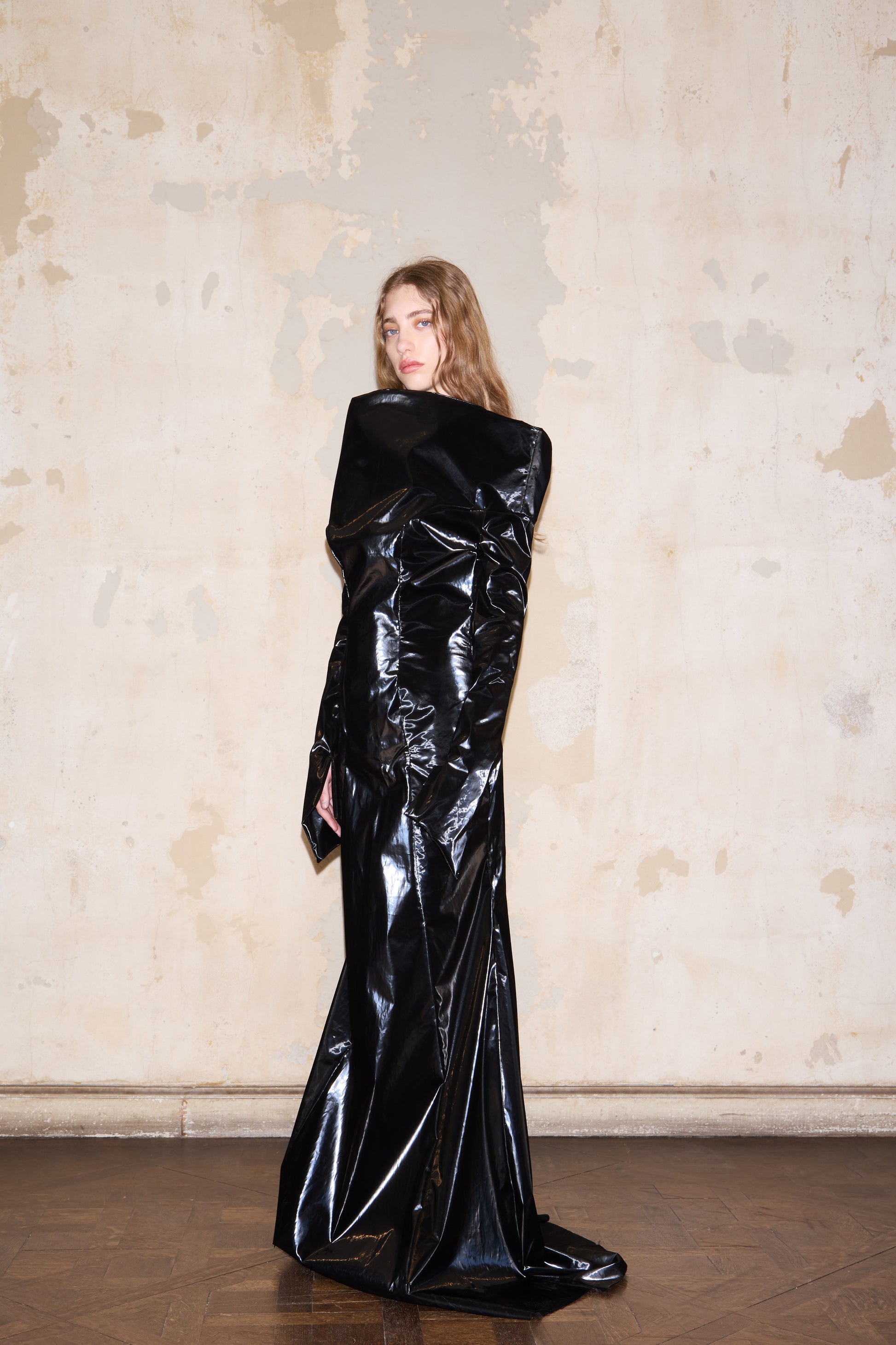 Vestido largo entallado al cuerpo con mangas, cuello alto con volumen, espalda con escote volcado.