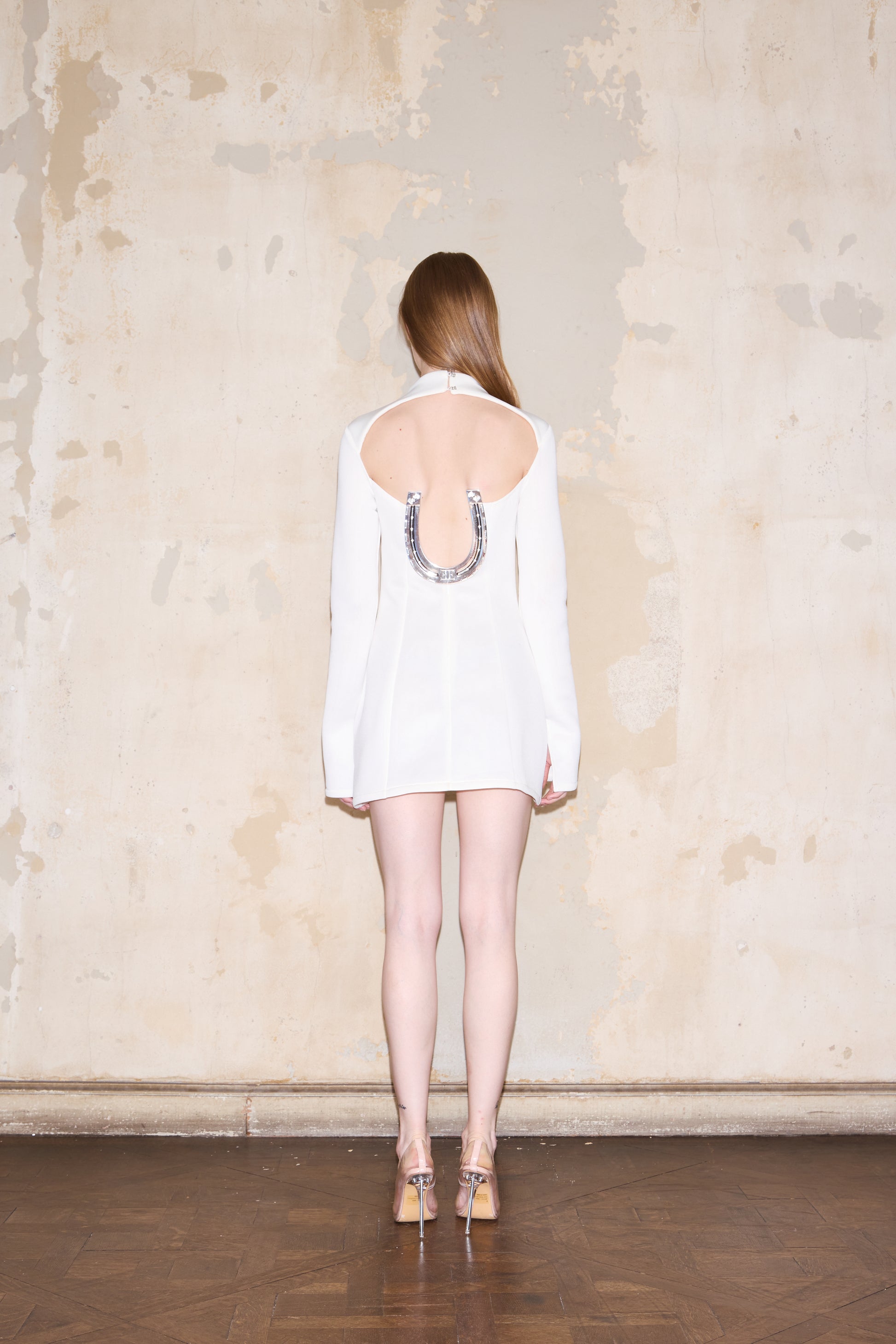 Vestido corto con estructura definida, mangas largas y cuello semi alto. Presenta bolsillos sastreros frontales y una espalda abierta destacada por un gran detalle en forma de herradura ESQUINA. Fabricado con tejido técnico de fabricación italiana.
